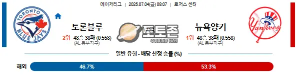 07월 04일 08:07 MLB 토론토 블루제이스 vs 뉴욕 양키스 | 야구 스포츠분석