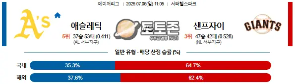 07월 06일 11:05 MLB 애슬레틱스 vs 샌프란시스코 자이언츠 | 야구 스포츠분석