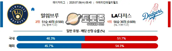 07월 09일 08:40 MLB 밀워키 vs LA 다저스 | 야구 스포츠분석