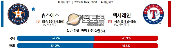 07월 12일 MLB 경기, 휴스턴 애스트로스와 텍사스 레인저스 맞대결 분석. 선발 투수 상황, 불펜 현황, 타격력 및 경기 승패 전망과 예상 스코어, 베팅 전략을 상세하게 제공합니다.