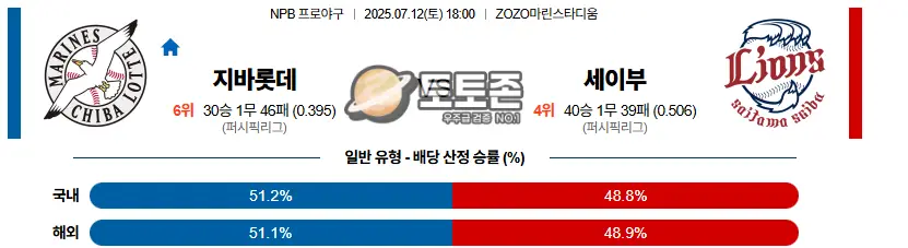 07월 12일 18:00 NPB 치바 롯데 마린스 vs 세이부 라이온즈 | 일본야구 스포츠분석
