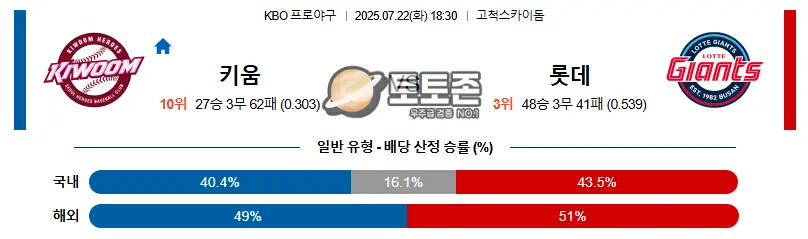 07월 22일 18:30 KBO 키움 vs 롯데 | 한국야구 스포츠분석
