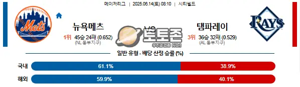 06월 14일 08:10 MLB 뉴욕메츠 vs 탬파베이 | 야구 스포츠분석