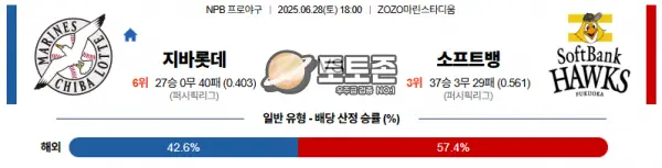 6월 28일 NPB 치바롯데 마린스와 소프트뱅크 호크스 경기 분석입니다. 선발 맞대결, 불펜 상황, 타격력 비교 및 경기 승패 예측을 자세히 안내합니다.